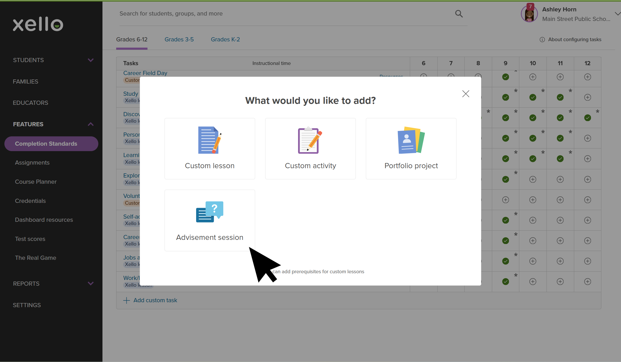 Educator account in Xello. The modal to add custom tasks is open and the cursor is selecting Custom activity