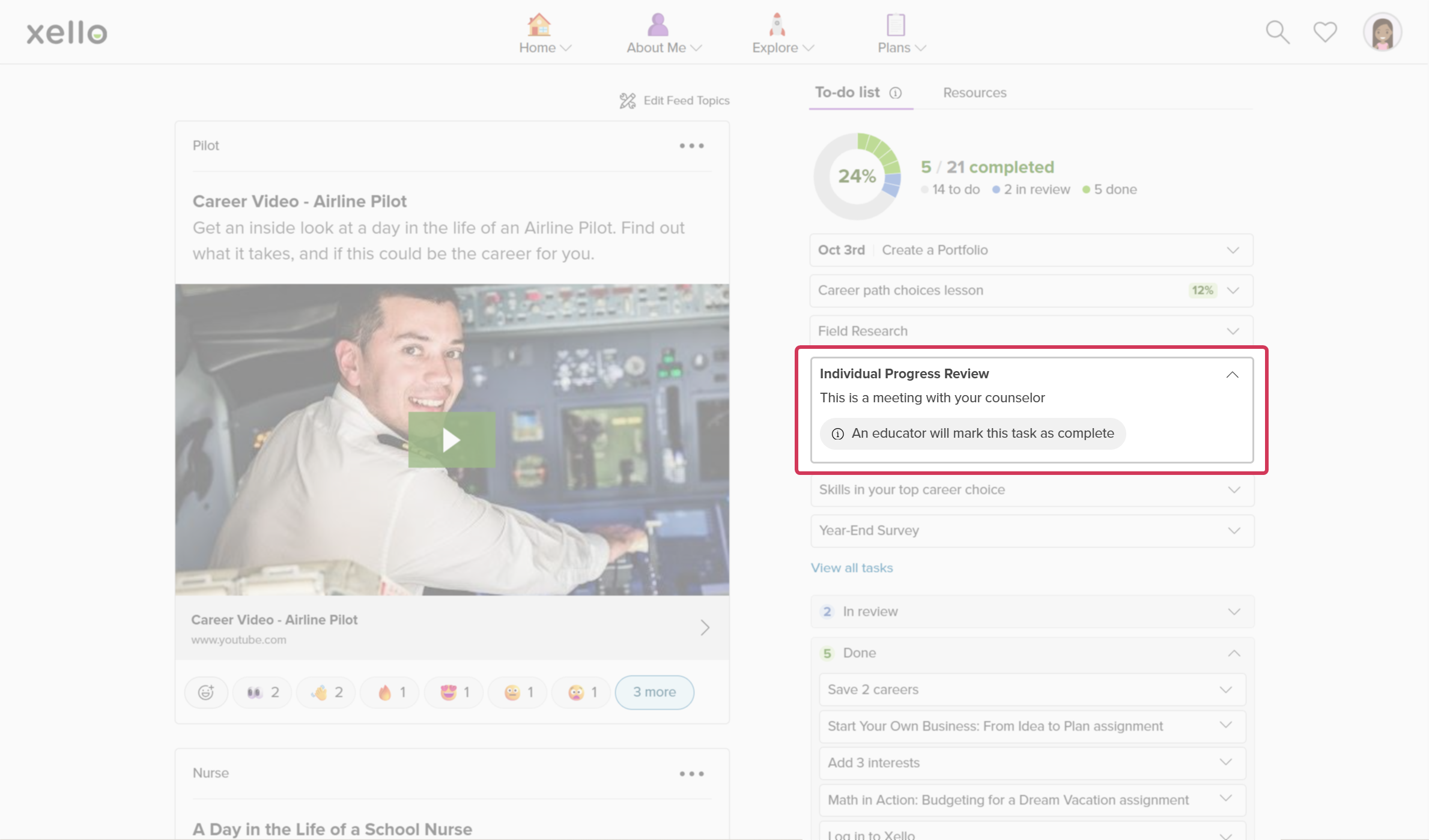 Use Custom tasks to build upon existing Xello activities or create entirely new activities that go beyond Xello's built-in curriculum. For example, create a custom lesson for students to update their resume with new experiences. Or assign a custom activity to track actions completed outside of Xello, such as creating a cover letter. Creating a portfolio project will help students organize and submit digital collections of their work.