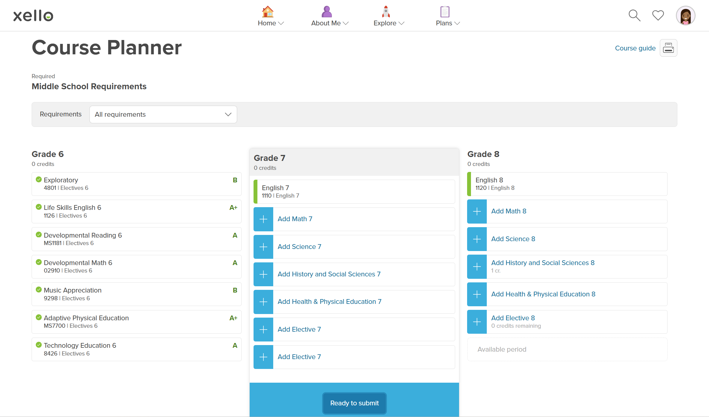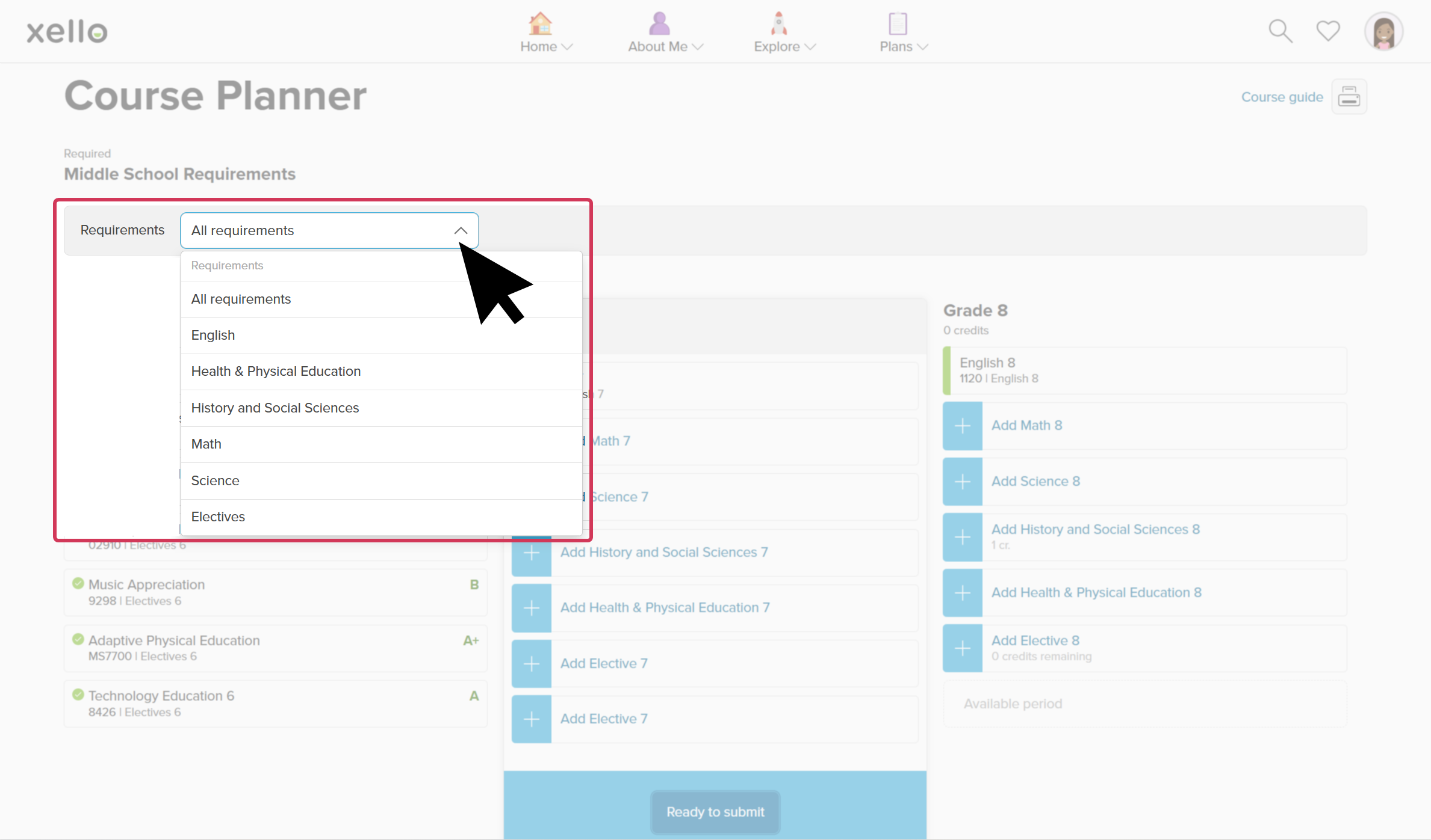 Using Course Planner in Xello, students can create their course plans for 7th and 8th grade. By picking their classes in middle school, they can gain confidence and familiarity for when it's time to build their high school course plans.